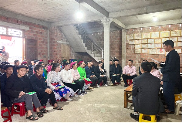 Đảng viên Vừ Mí Cáy - Tổ trưởng Tổ tiết kiệm và vay vốn thôn Há Ía tổ chức buổi sinh hoạt định kỳ, cùng bà con chia sẻ những kinh nghiệm về sản xuất, chăn nuôi