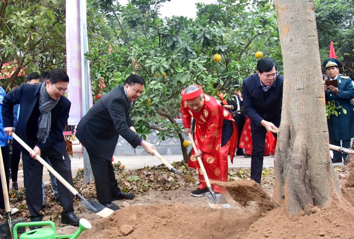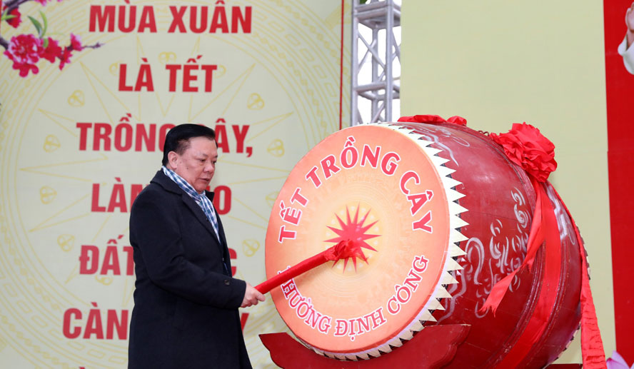 Trong không khí tươi vui và phấn khởi của buổi lễ, Bí thư Thành ủy Đinh Tiến Dũng đã đánh hồi trống phát động Tết Trồng cây “Đời đời nhớ ơn Bác Hồ”. Tiếp đó, đồng chí Bí thư Thành ủy đã cùng các cụ cao niên trồng cây trong khuôn viên cụm di tích Đền, đình, miếu Định Công Thượng.